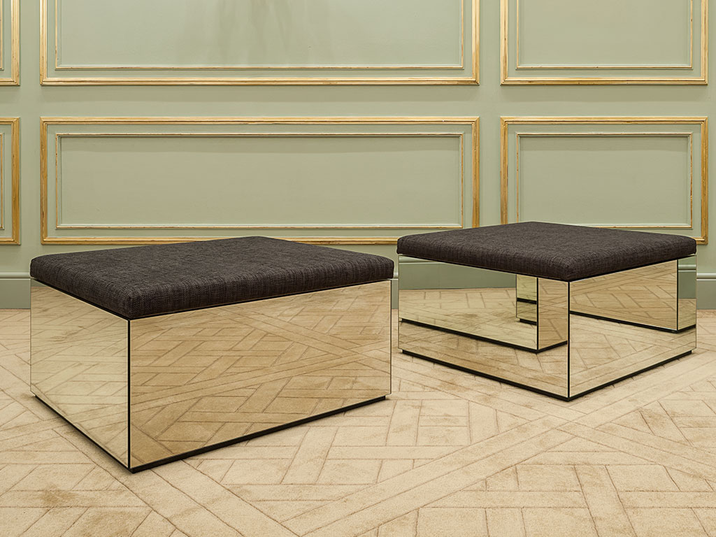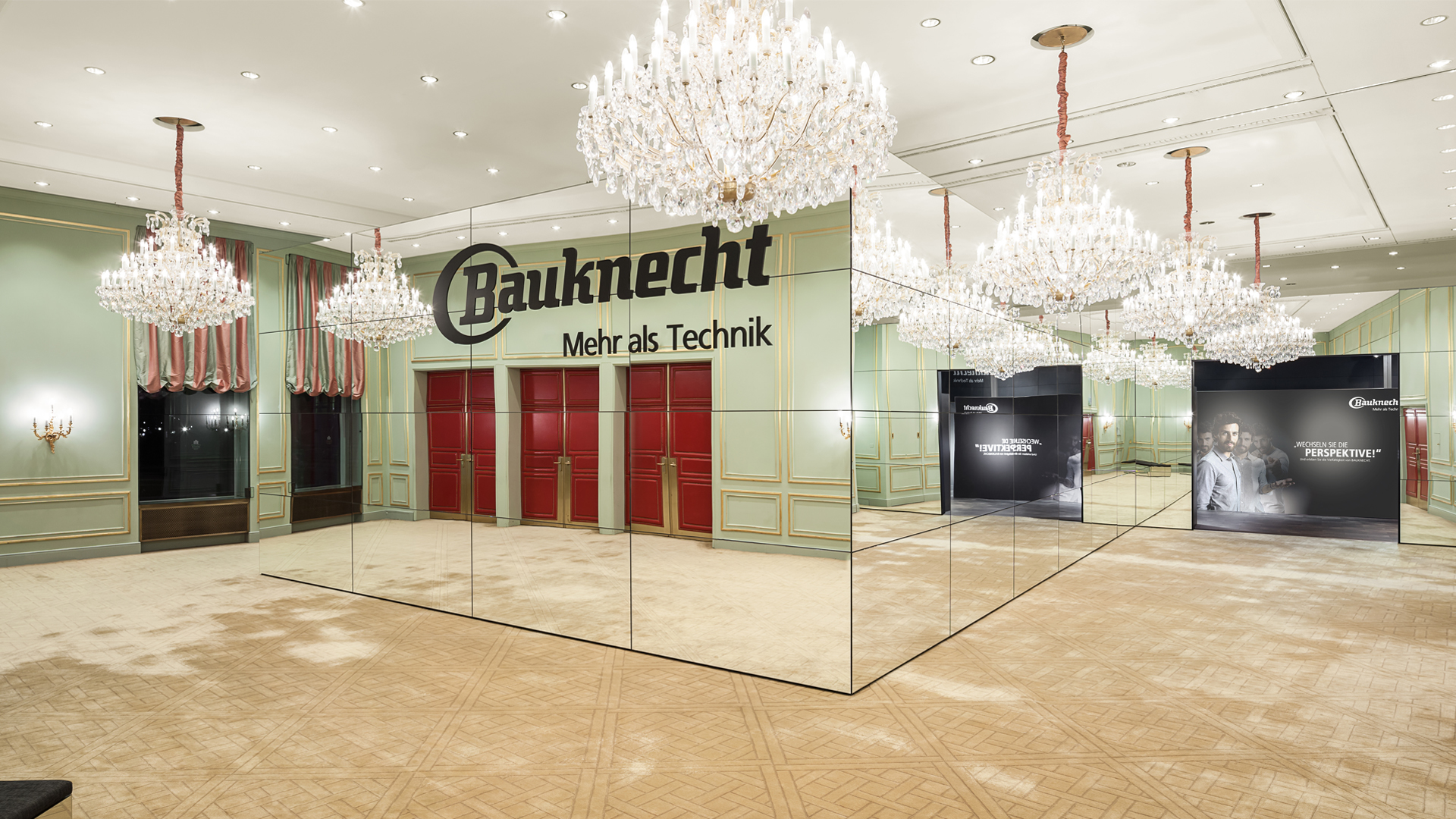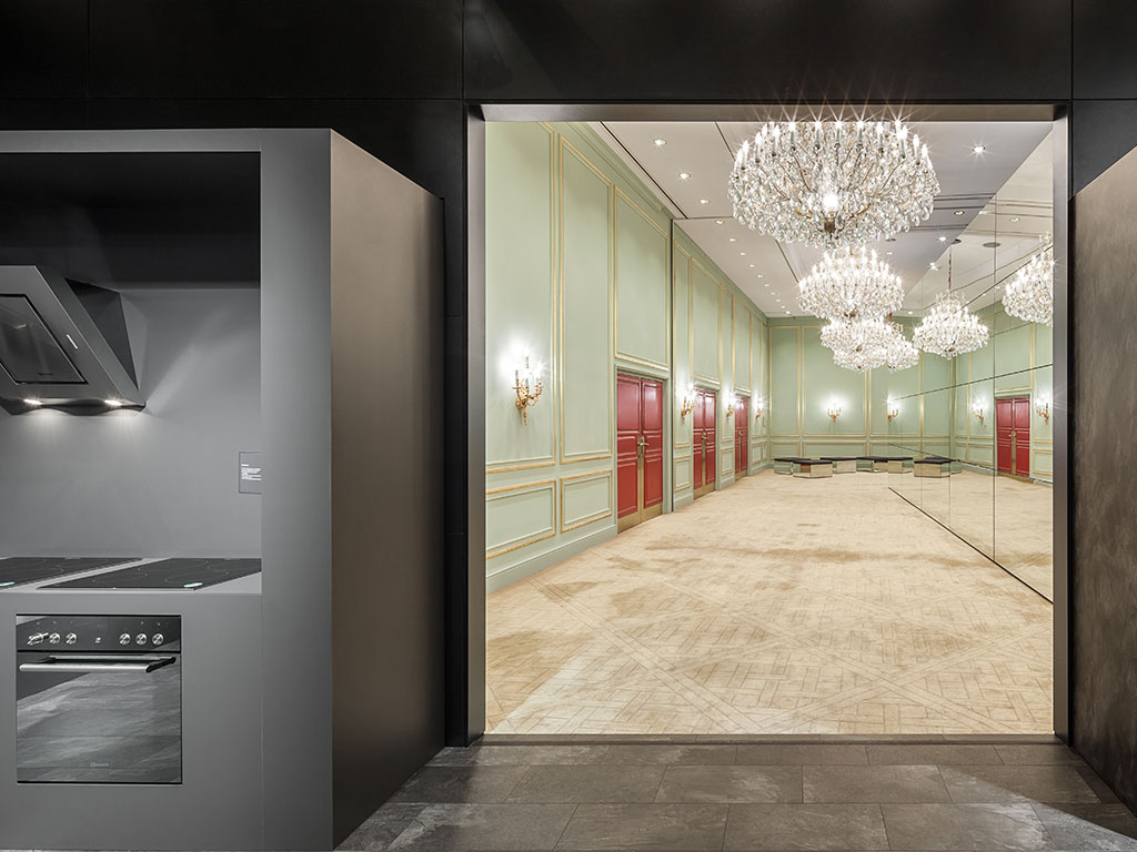 Der vollflächig verspiegelte Showroom lässt den prunkvollen Palaissaal und die Präsentationsfläche optisch miteinander verschmelzen und schafft mit moderner Geradlinigkeit einen eindrucksvollen Kontrast zum historischen Ambiente des Saals.