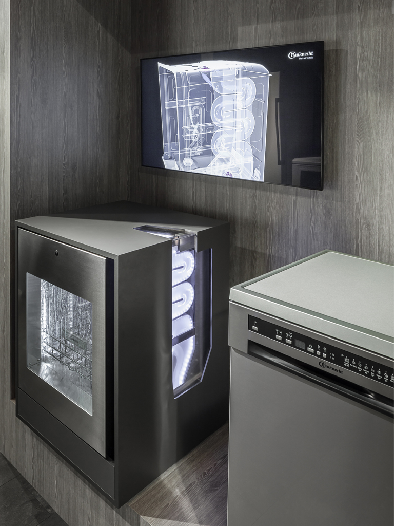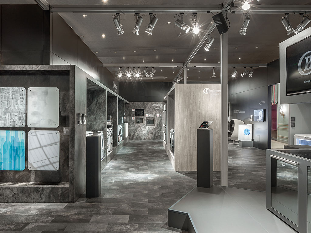 Im Inneren präsentieren anthrazitfarbene Module die Bauknecht Markenwelt. Materialien wie Schiefer und grau gebeiztes Holz setzen markante Akzente und kontrastieren elegant mit den Pastellfarben des Hotels – für eine inszenierte Verbindung von Produkt, Raum und Markenwert.