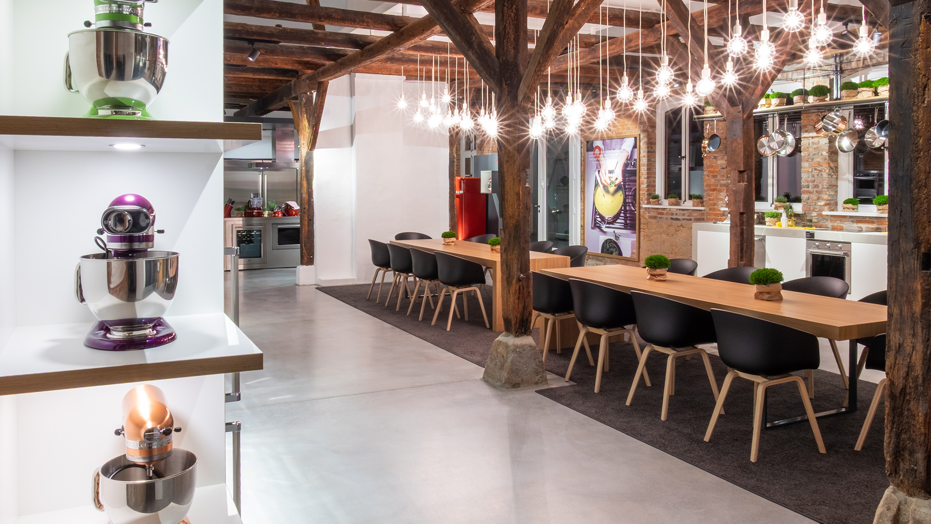 The interior design deliberately combines the archaic materiality of the existing structure with the clear design language and color palette of KitchenAid products. Visible masonry, original wooden beams, and historic window openings stand in exciting contrast to the high-quality, color-intensive appliances. This creates a showroom that impresses both emotionally and functionally.