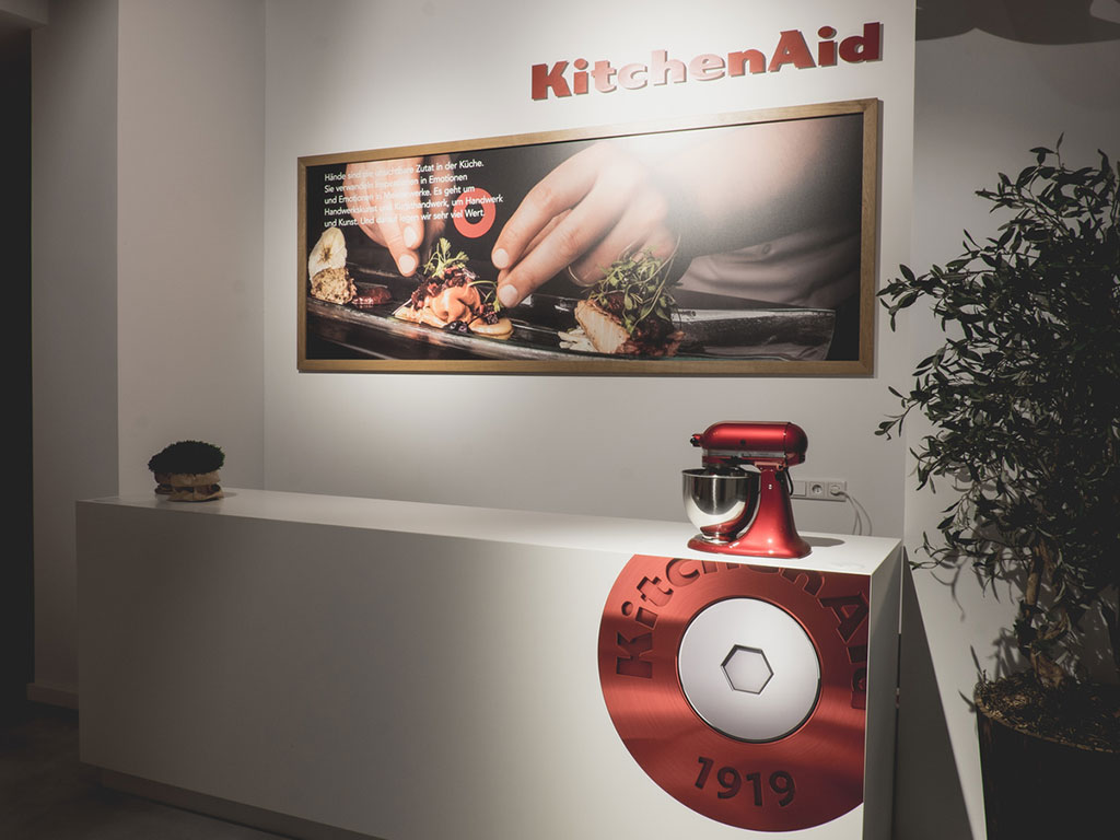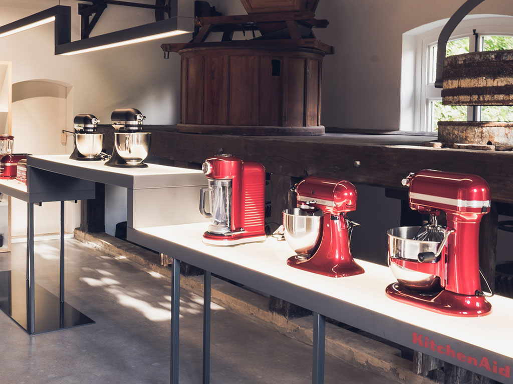 For almost 100 years, KitchenAid has stood for uncompromising quality, professional functionality, and iconic design. In addition to the legendary “Artisan Stand Mixer,” the product range today includes a wide array of high-quality products. The showroom at Gut Böckel makes these brand values spatially tangible and conveys an authentic brand experience.