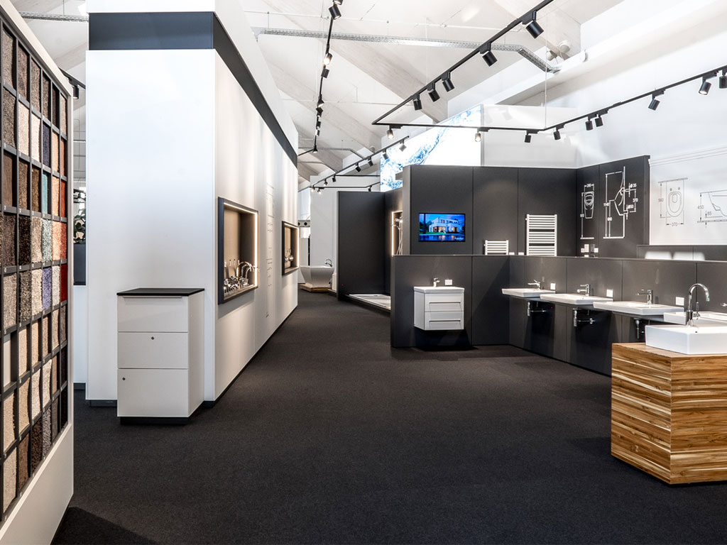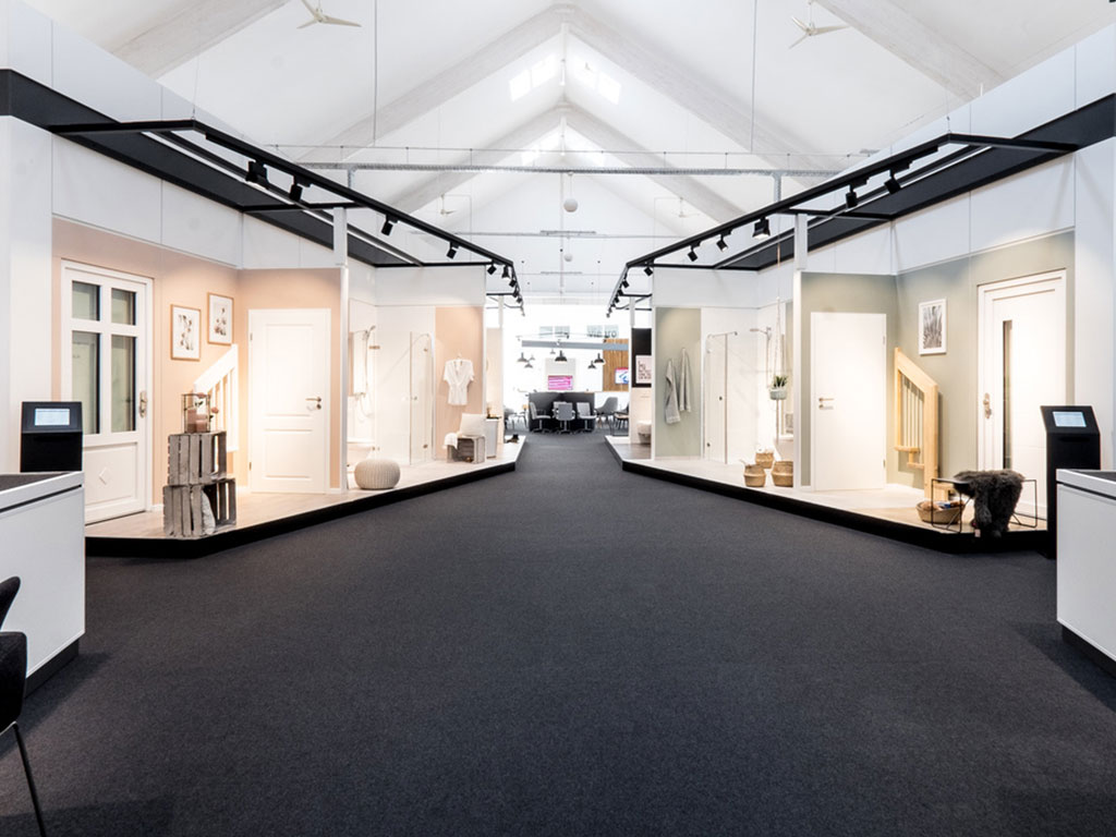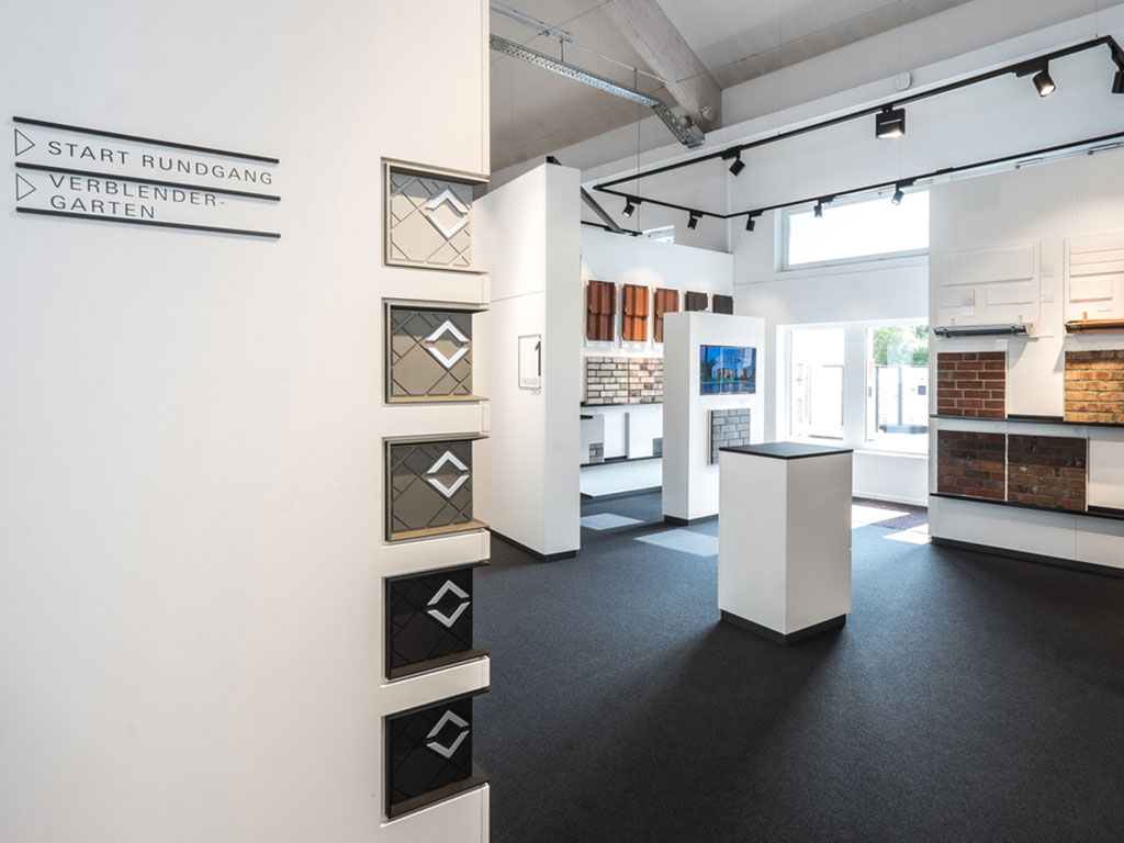 The showroom impresses with its clear structure, high functionality, and inspiring atmosphere. Stylishly designed themed areas in the central section offer inspiration, while separate consultation islands allow homeowners to make decisions at their leisure. Around the central area, product sections for facades, windows, doors, tiles, bathrooms, and much more are clearly and accessibly arranged.