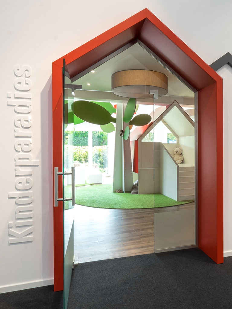 The spacious reception area warmly welcomes visitors and directs them either to a tour of the show home park or directly to the selection center. A comfortable lounge island invites visitors to linger, while the adjacent children’s paradise shortens the waiting time for the youngest visitors.